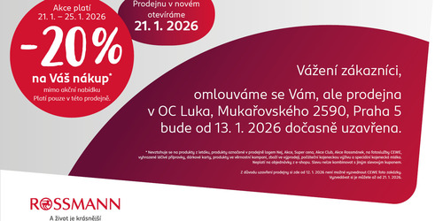 Otevírací akce –20 % na celý nákup* Platí v termínu 21.–25. 1. 2026 pouze v této prodejně.