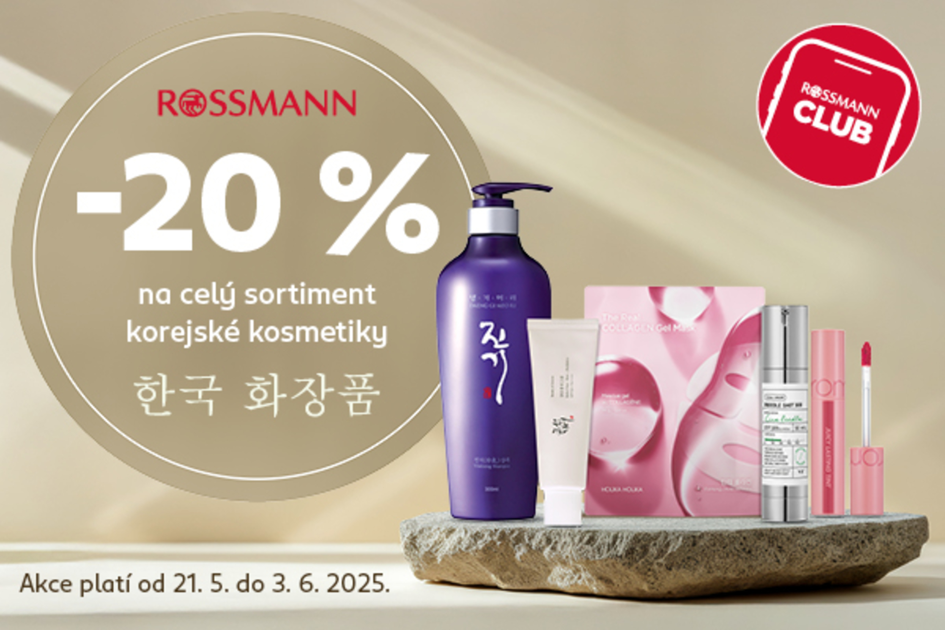 Sleva 20 % na korejskou kosmetiku je tady! Vaše oblíbené pleťové masky, esence a krémy teď pořídíte výhodněji – a vaše pleť vám za to poděkuje. Akce platí do 3. 6. exkluzivně pro členy ROSSMANN CLUBu, tak si ji nenechte ujít!